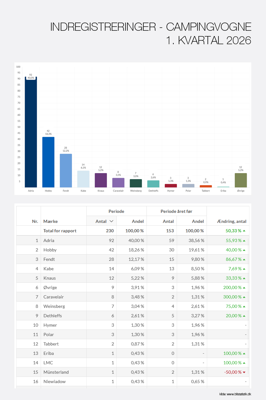 Samtidig er indregistreringen af nye campingvogne fordoblet fra 1. januar til slutningen af marts 2026 sammenlignet med samme periode sidste år. Adria sidder på omkring 40% af markedet.